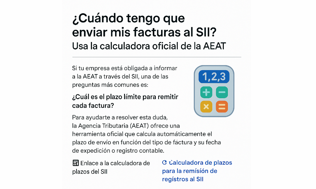 Para ayudarte a resolver esta duda, la Agencia Tributaria (AEAT) ofrece una herramienta oficial que calcula automáticamente el plazo de envío al SII en función del tipo de factura y su fecha de expedición o registro contable.